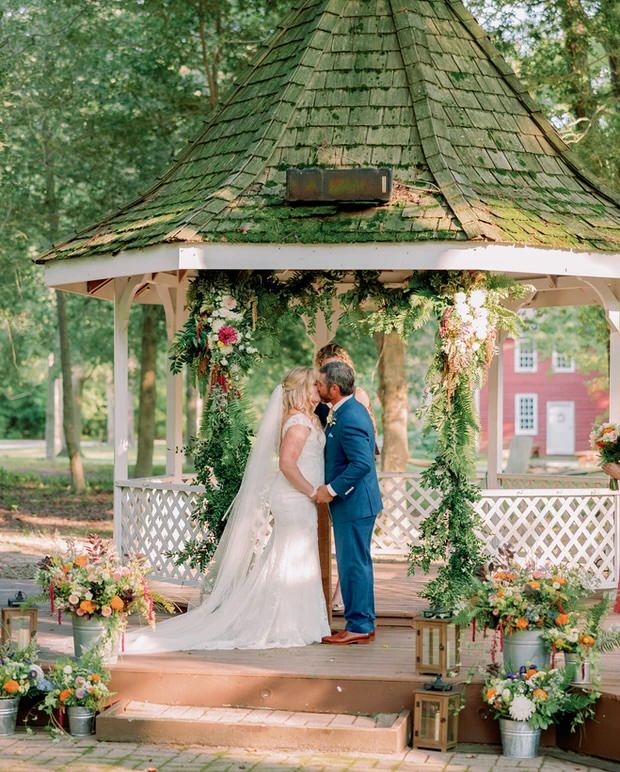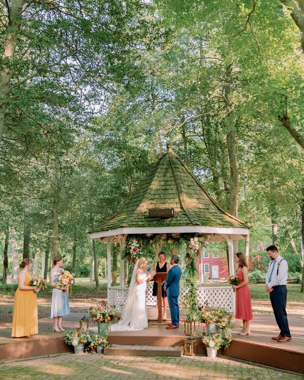 The ceremony space has a lovely gazebo where you can exchange your vows and plenty of wooden benches for your guests. Cocktail hour is hosted both inside and out in the courtyard of a historic tavern on the property.